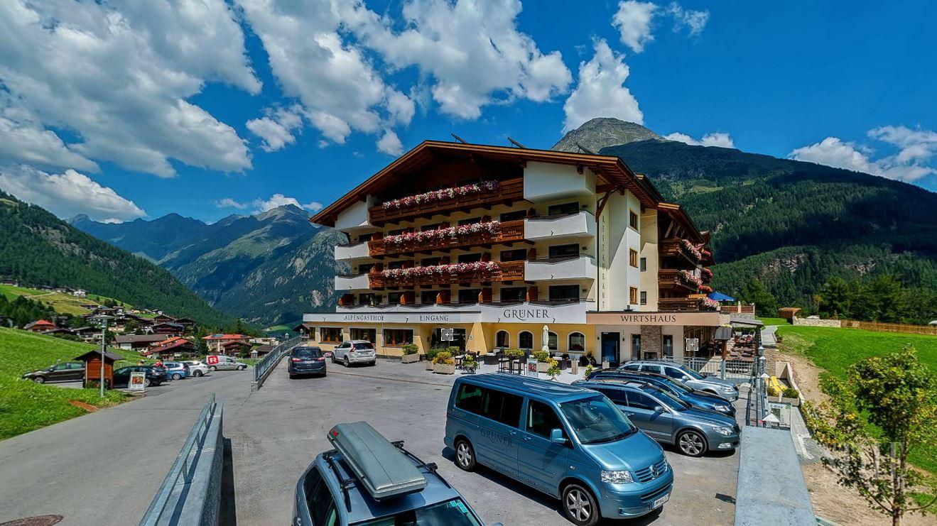 Az Alpengasthof Grüner remek fekvésű épülete magasan Sölden felett, közvetlenül a sípálya mellett található.
